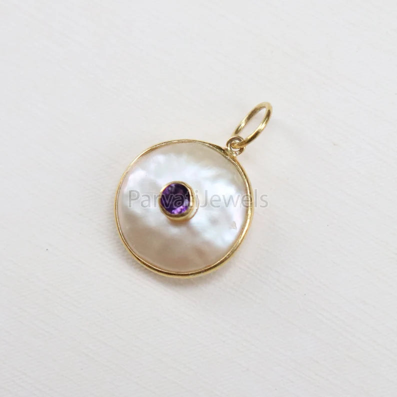Natural Amethyst & Disc Pearl Charm, 18k Solid Gold Charm, Natural Pearl Gold Charm, Pearl Charm Necklace, February Birthstone, SOLID 18K