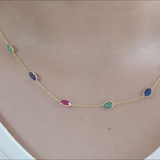 Natural Ruby Emerald Sapphire Necklace, 14k Solid Gold Necklace, Natural Multi Gemstone Necklace, Gold Necklace, Birthstone Gold Necklace